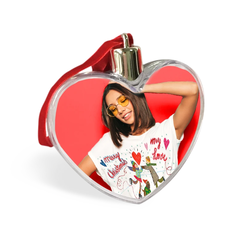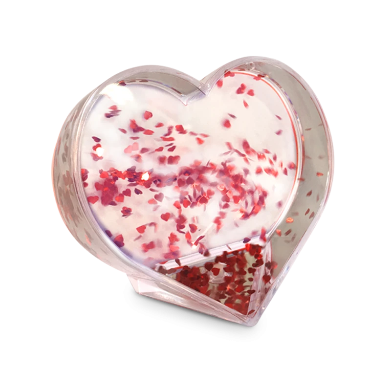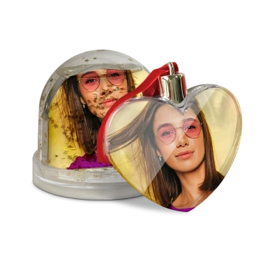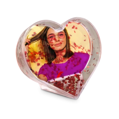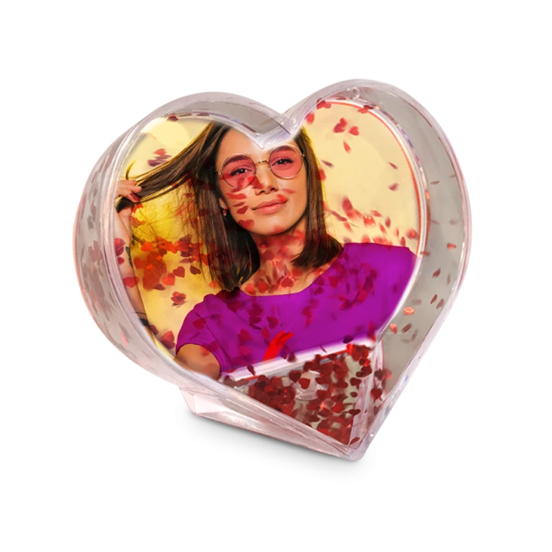 Globo portafoto trasparente in MDF con acqua e brillantini luccianti colorati all'interno e base di sostegno.