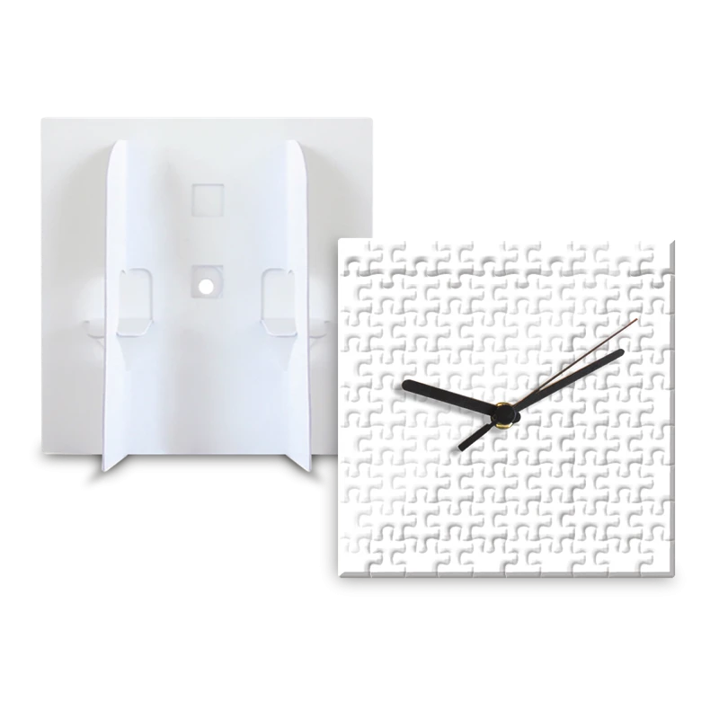 Orologio puzzle quadrato con supporto da tavolo (automontante in cartone) e gancio da parete.