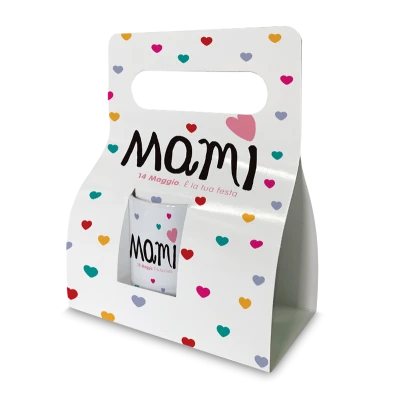 Cartoncino ultrabrillante e resistente; automontante con finestra e ad incastro per il sostegno della tazza.